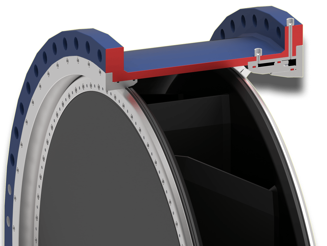 A special NBR profile (70-85 ShA hardness, depending on operating conditions) is placed in the disk and secured by a stainless steel clamping ring, which allows for adjustable clamping force. Depending on the diameter, the clamping ring is manufactured either as a single piece or from segments.